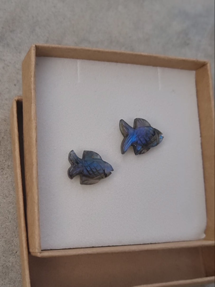This crystal pendant is made from fine quality Labradorite gemstone, was hand carved in fish shape and was finished using Sterling Silver / 14kt Gold Plated on Brass findings.